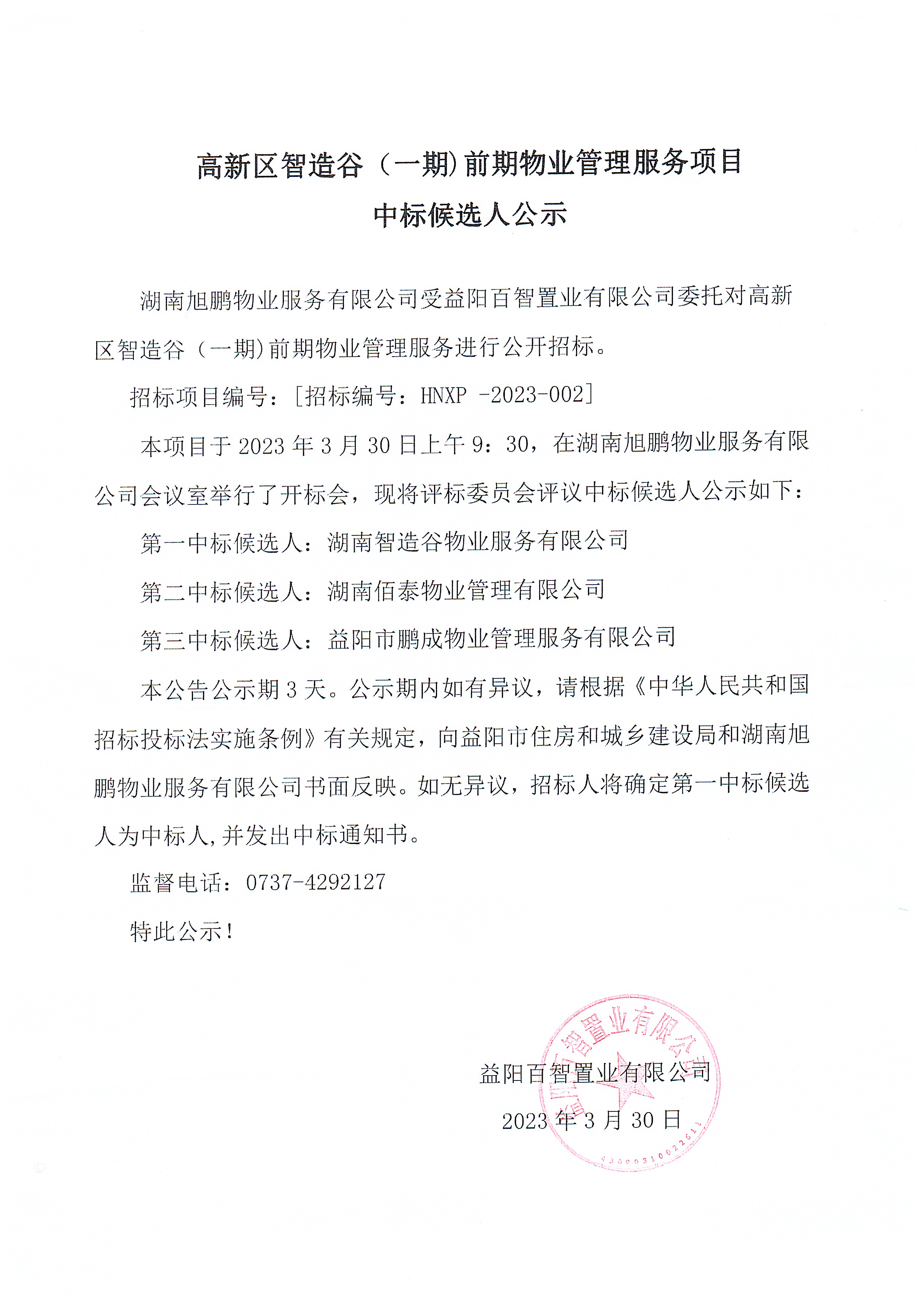 高新区智造谷(一期)前期物业管理服务项目中标候选人公示