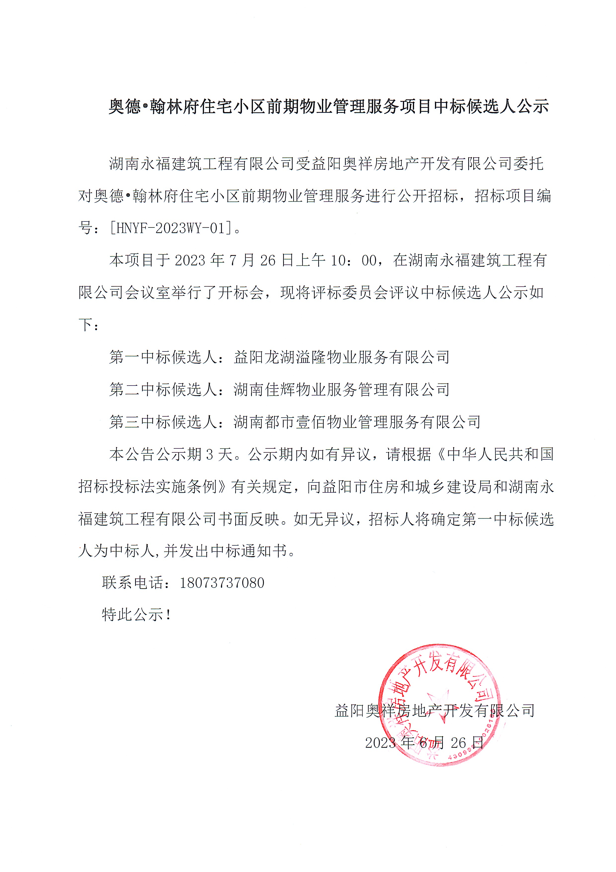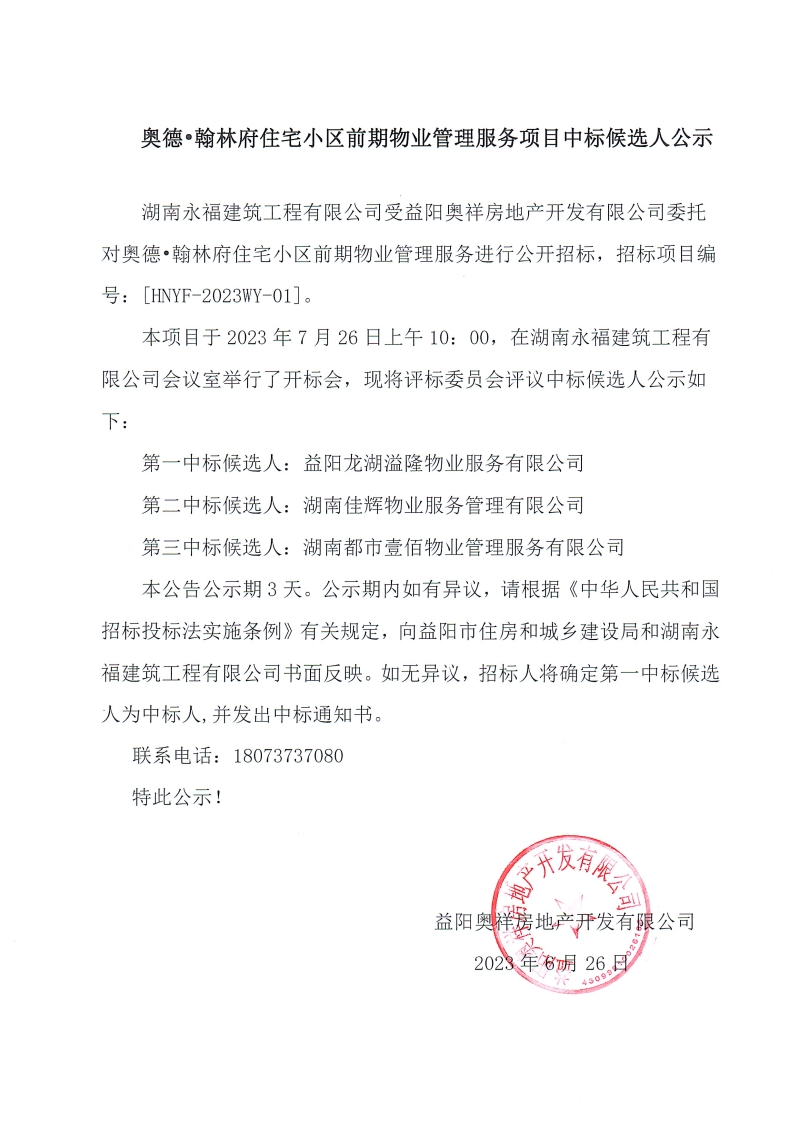 奥德翰林府住宅小区前期物业管理服务项目中标候选人公示