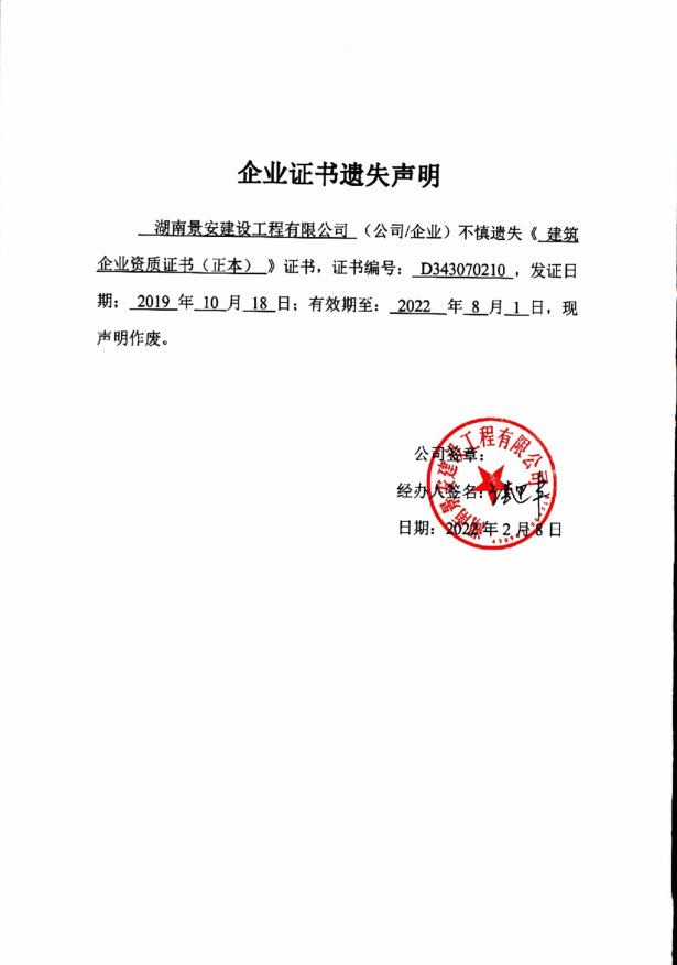 湖南景安建设工程有限公司建筑业企业资质证书遗失声明