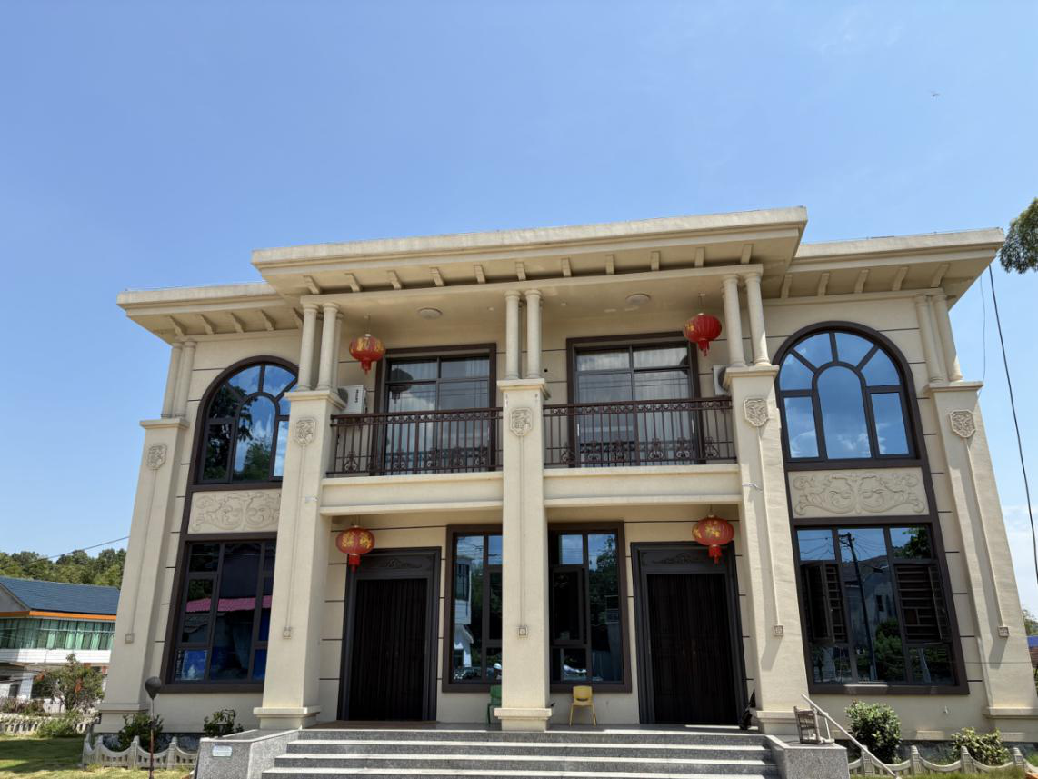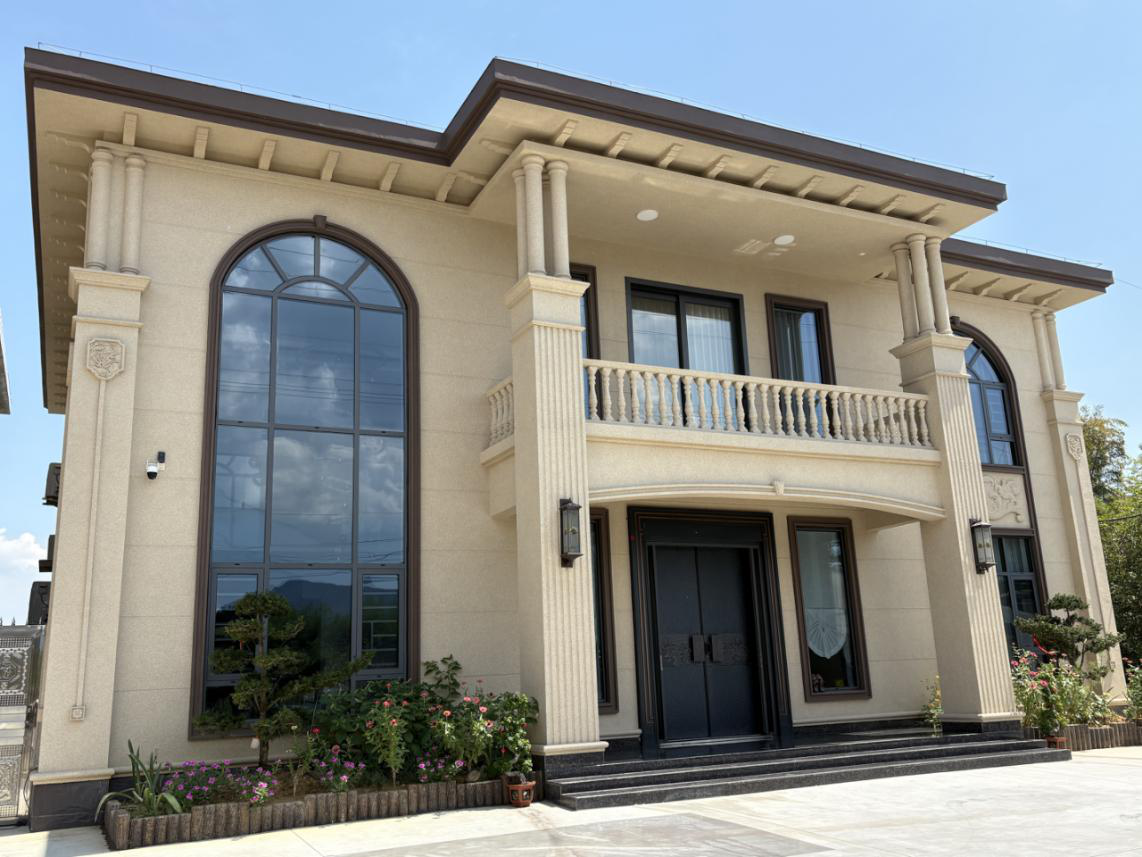 房屋融合欧式建筑元素,整体造型规整大气。运用多根立柱,增强建筑立体感与庄重感,搭配拱形大窗,丰富立面形态,色彩上采用浅色调外墙,简洁又显精致。风格融合上将欧式建筑的立柱、拱窗等元素,与中式灯笼装饰结合,实现中西风格碰撞融合,既展现欧式建筑的典雅大气,又融入中式传统韵味,满足多元审美与文化内涵需求。功能与美观兼顾上通过合理门窗布局,保障室内采光、通风等实用功能,同时以规整造型、精致装饰,塑造美观外观,让建筑既宜居又具观赏价值,打造舒适且彰显品味的居住空间。