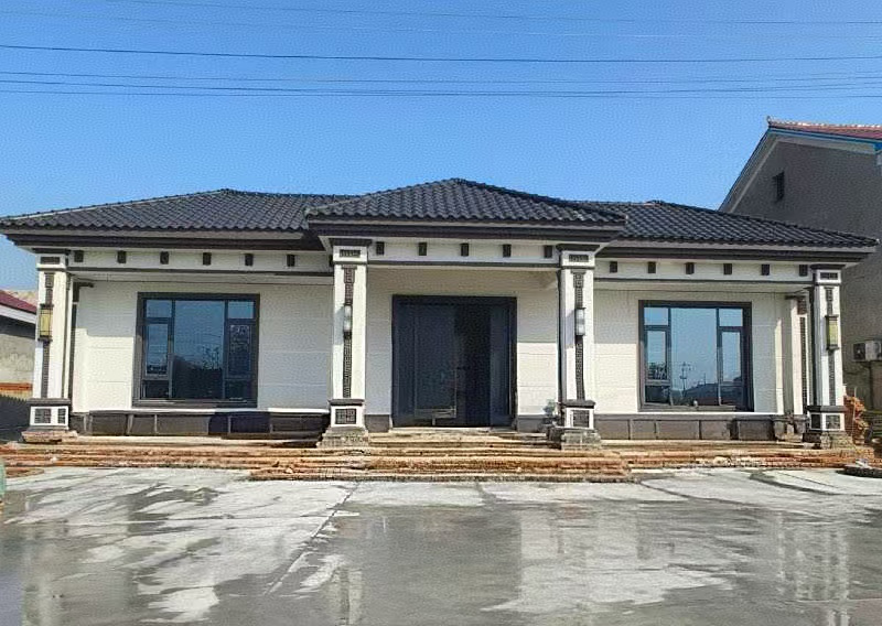 设计/施工特色:建筑主体采用坡屋顶搭配简化的中式立柱造型,既延续了本地乡村建筑的传统意象,又通过利落的线条处理呈现出简洁的现代美感,精准贴合当地居住审美。墙面瓷砖铺贴平整严密,立柱的雕花装饰线条刻画精细规整,充分体现了工匠的严谨作风与高超工艺水平。大面积窗户的设计确保了室内充足的自然采光,通透的平层布局则顺畅地组织了家庭日常活动动线,彰显了其“实用耐住”的核心建造原则。在材料选择上,外墙采用防水性能优良的瓷砖,檐口等部位选用耐腐蚀的现代材料,有效提升了建筑在乡村环境下的耐久性与抗风雨能力。通过科学的选材与构造,合理控制了整体建造成本,使之更广泛地适配农户的实际需求与经济条件。