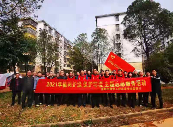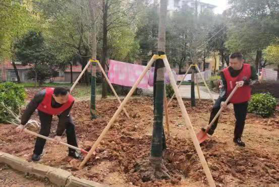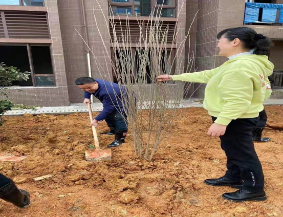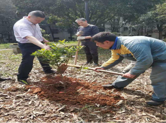 市质安监站50名志愿者来到老旧小区全丰小区,种植银杏树、茶花树25棵。