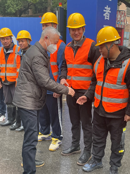 2023年1月22日大年初一上午,益阳市西流湾溢流问题综合整治工程指挥部副指挥长、市住建局党组书记、局长熊寿林在指挥部项目工作专班主任、市住建局党组成员、副局长周光辉的陪同下,对中心城区水环境综合治理PPP项目金山北路雨水顶管工程的一线施工人员进行了慰问。