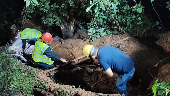市自来水公司随即启动应急响应,第一时间关阀处理爆管现场,并在凌晨2点36分发布停水信息,向监管部门和市长热线报备。公司总经理和相关负责人立即赶到现场,指导抢修工作。由于爆管位置位于复杂的渠道沟边坡,施工难度大,抢修队伍克服重重困难,连续作业12小时,于5月5日下午3点成功恢复供水。