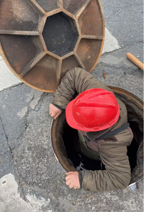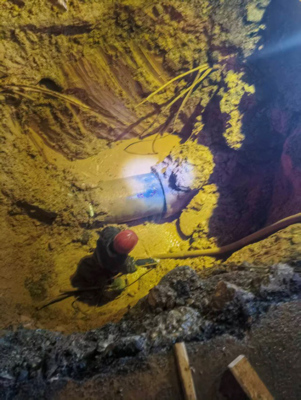 抢修现场,由于爆管处为DN600水泥管,口径大、埋深深,且地下管线复杂,作业难度极大。正值春节,施工机械调配不易,但抢修人员没有丝毫退缩。有的队员刚端起团年饭的饭碗,接到指令后立即奔赴现场;有的队员家中孩子尚幼,仍选择坚守岗位。他们克服低温严寒、作业面狭窄等多重挑战,昼夜奋战、争分夺秒。泥水浸透工服,寒风冻僵手脚,但没有人停下手中的工作——坑下轮番作业,坑上科学调度,只为早一秒恢复供水。