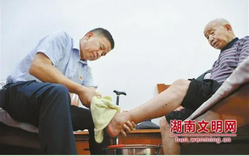 (安化县南金乡,肖飞在帮父亲洗脚。图片来源:湖南文明网)