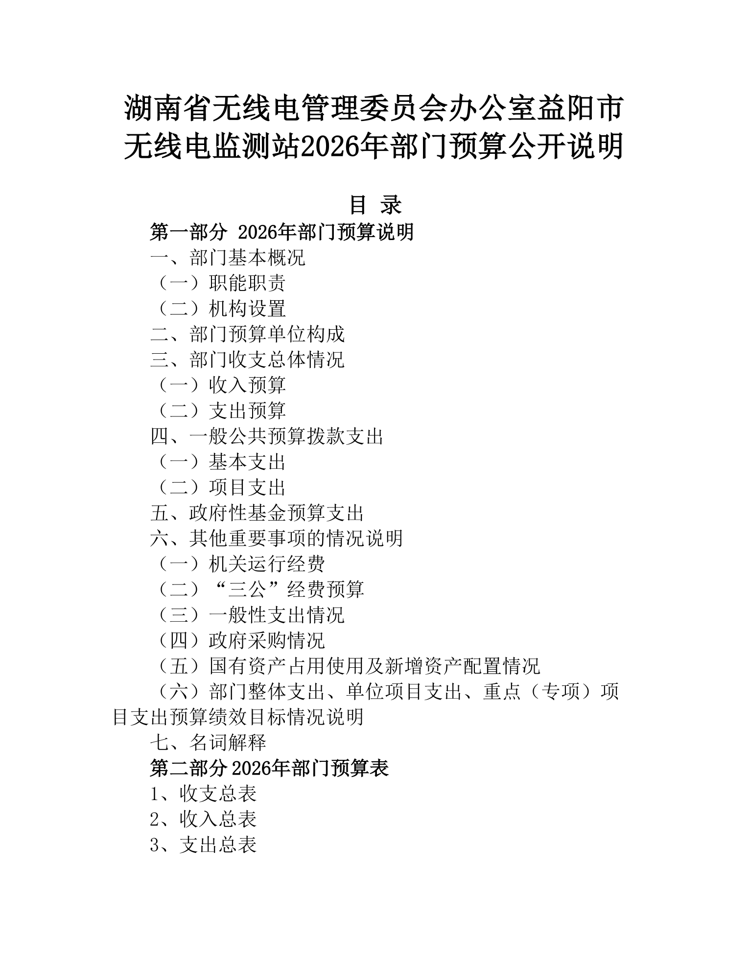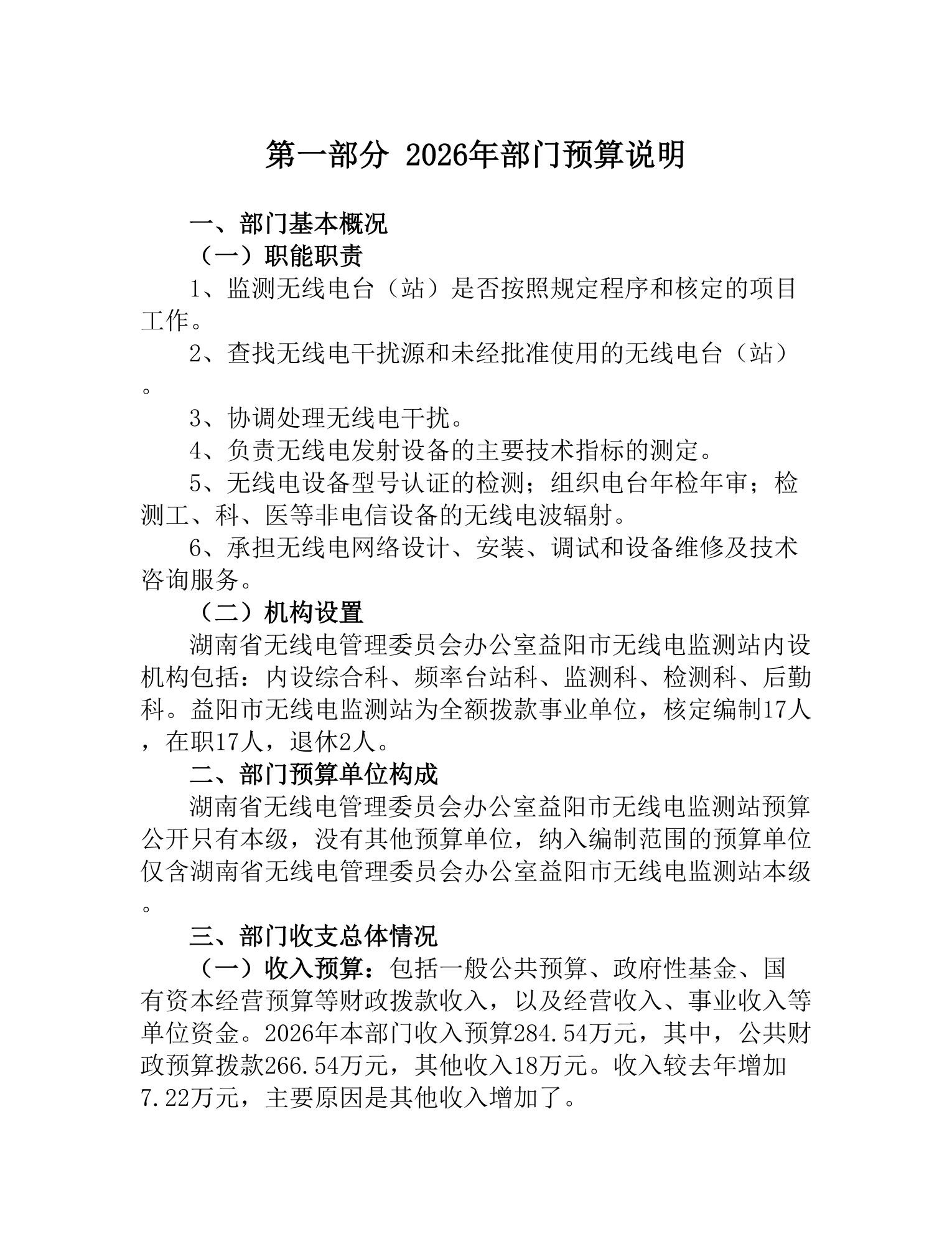 湖南省无线电管理委员会办公室益阳市无线电监测站2026年部门预算公开说明