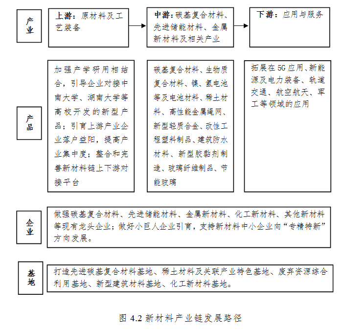 关键技术和产品创新:做大做强先进复合材料、金属新材料、化工新材料、特种无机非金属材料等新材料产业链。加快培育和发展前沿新材料,做好超导材料、纳米材料、石墨烯材料、生物基材料、智能材料等战略前沿材料提前布局和研制;加强产学研用相结合,引导企业对接中南大学、湖南大学等高校开发的新型产品;加快新材料的应用端技术突破。