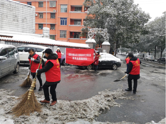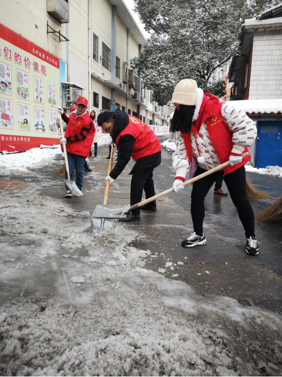 “多谢你们把雪铲了,这下我再不会摔跤了!”家住银都新村的王大妈昨天出行,不小心在小区前面的积雪下坡路上滑了一跤,正犹豫着今天还要不要出门时,却惊喜地发现积雪不见了,一抹亮丽的志愿红正拿着铲子、扫帚清理积雪,开辟人行道。