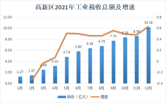 1-12月工业税收10.18亿元,同比增长63.02%,占全区税收的42.30%,较上一年度上升12.1个百分点。