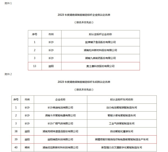 日前,湖南省工业和信息化厅网站上公示了2023年度湖南省智能制造标杆企业和标杆车间拟认定名单,资阳区的奥士康股份科技有限公司、益阳维胜科技有限公司等2家企业成功入围。