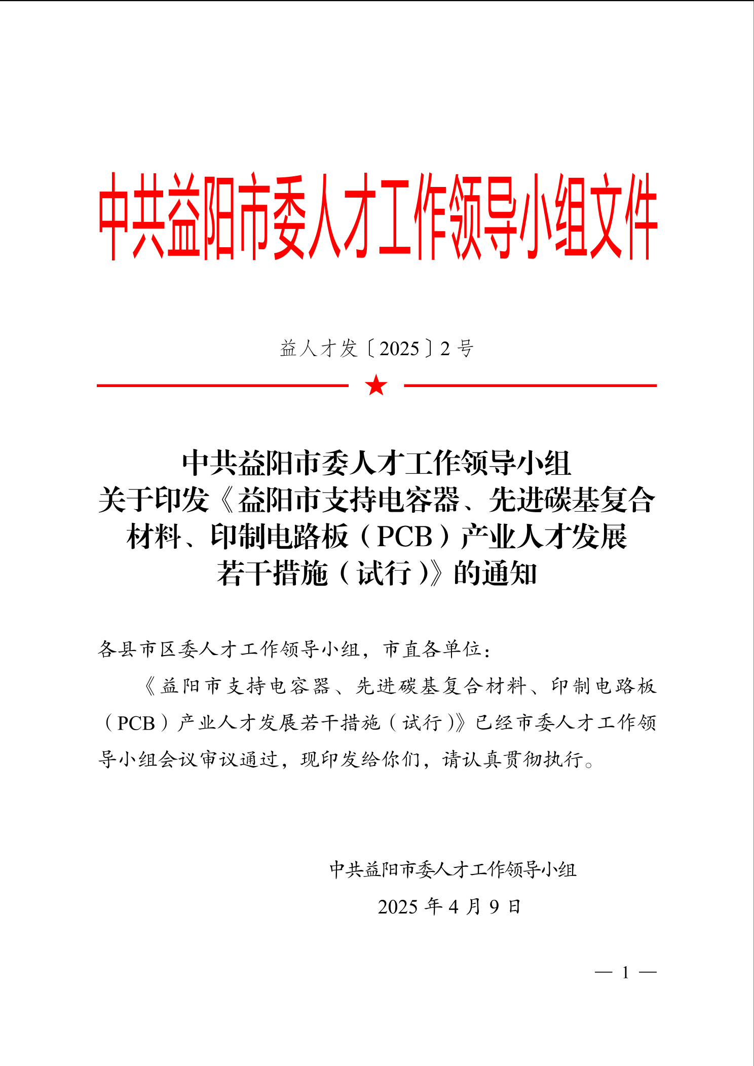 中共益阳市委人才工作领导小组关于印发《益阳市支持电容器、先进碳基复合材料、印制电路板(PCB)产业人才发展若干措施(试行)》的通知