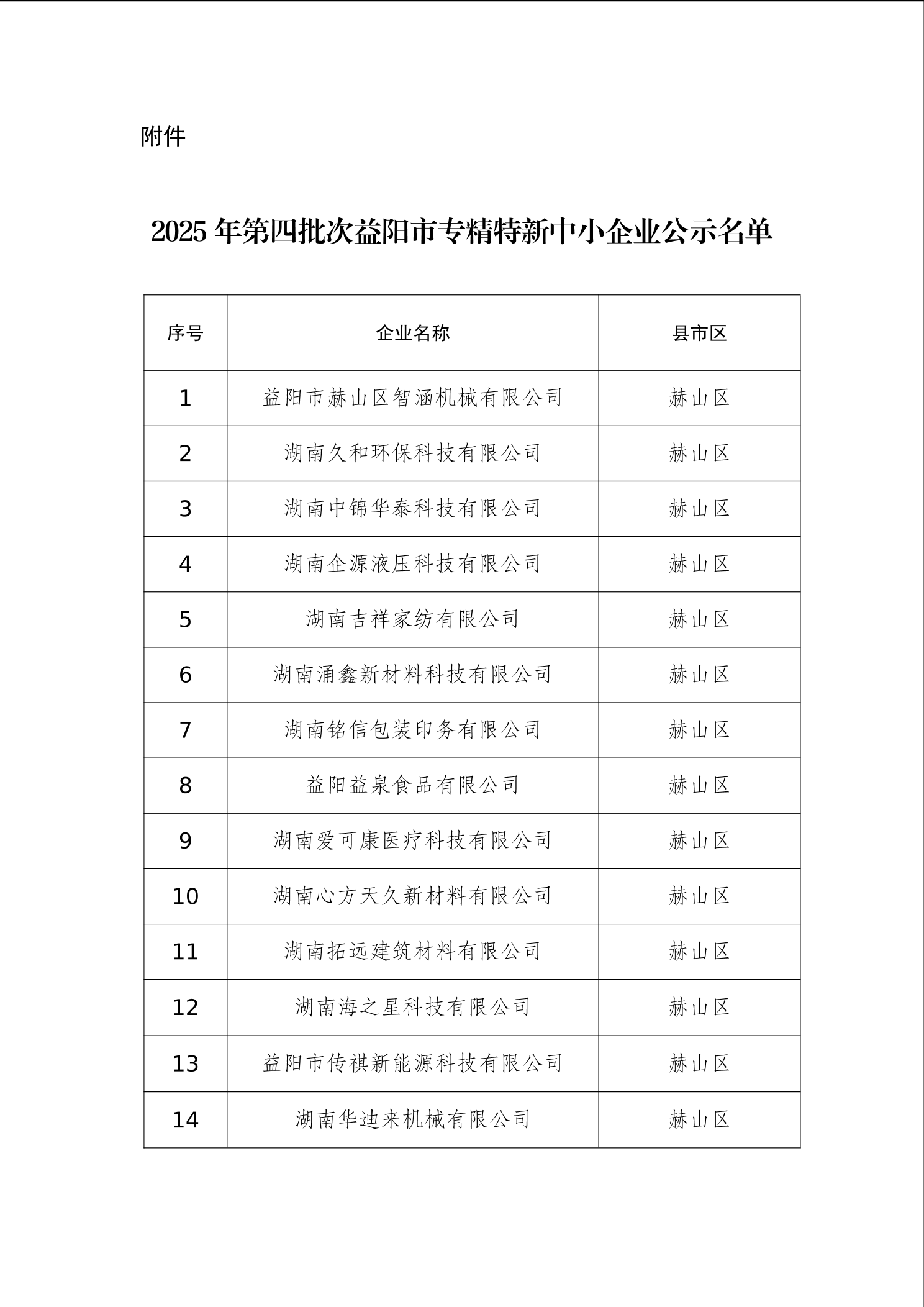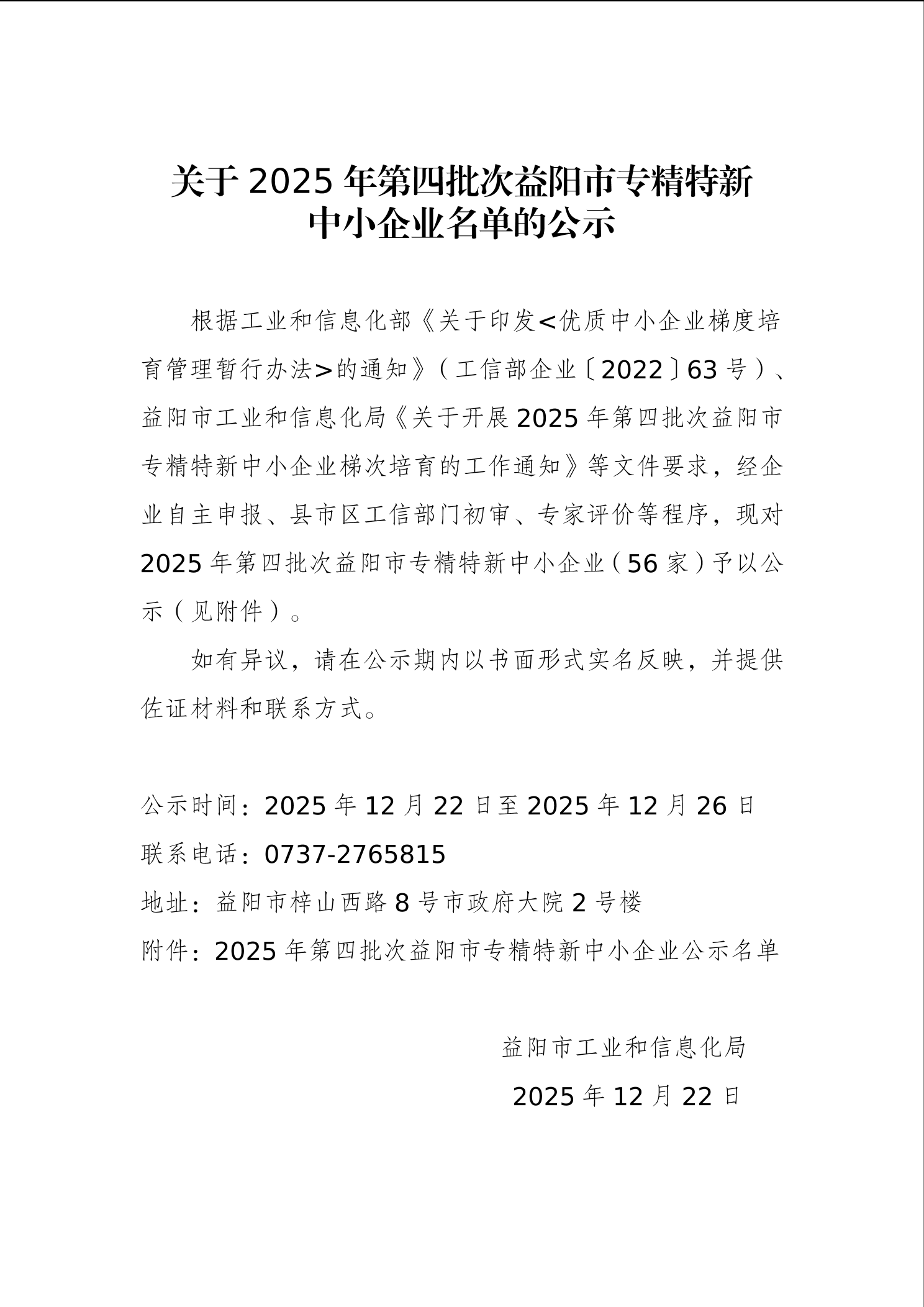 关于2025年第四批次益阳市专精特新中小企业名单的公示
