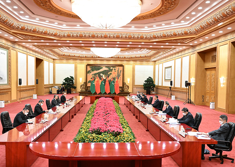 2月5日上午,国家主席习近平在北京人民大会堂会见来华出席北京2022年冬奥会开幕式的土库曼斯坦总统别尔德穆哈梅多夫。新华社记者 李响 摄