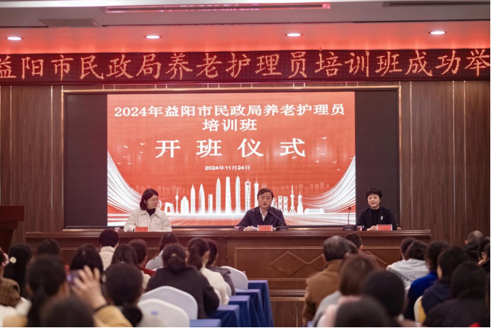 11月24日上午,益阳市2024年养老护理员培训班正式开班。此次培训由益阳市民政局主办,旨在提升养老护理员专业技能,以应对日益增长的养老服务需求。益阳市民政局党组成员、副局长龚盈科,湖南女子学院社会发展学院副院长唐永芳,老年学专业教研室主任陈诗雨出席开班仪式,全市各养老机构135名养老护理员参加培训。仪式由益阳市民政局养老服务科科长张玉春主持。