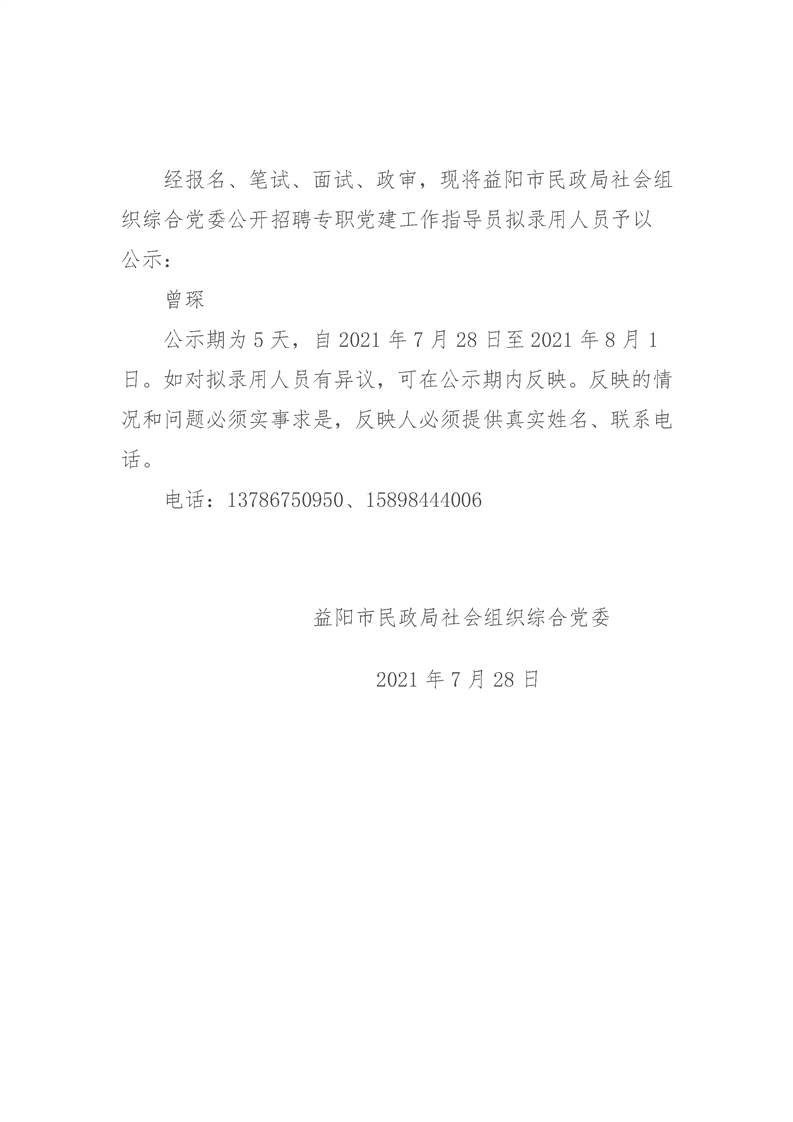 2021年益阳市民政局社会组织综合党委 专职党建指导员招聘拟录公示