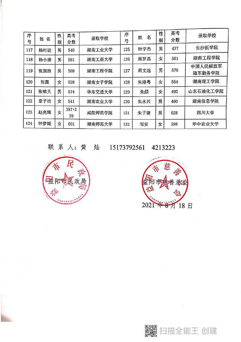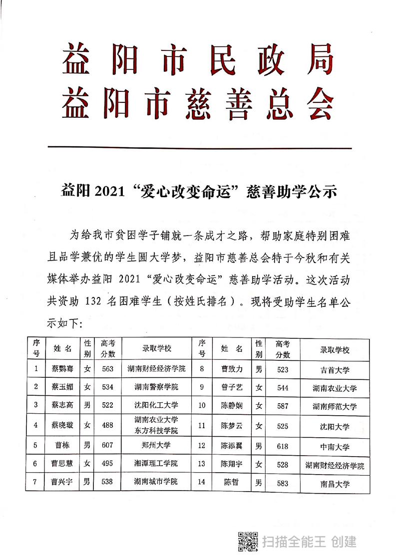 益阳2021“爱心改变命运”慈善助学公示