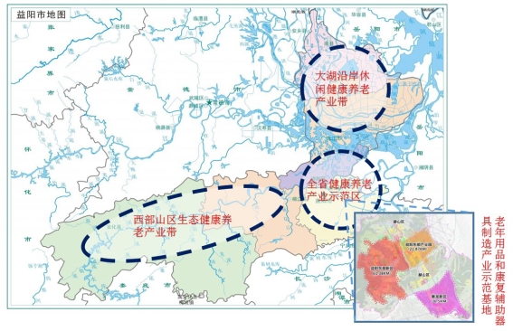 (四)形成优势显著特点鲜明的健康养老产业空间布局。根据行业发展特点、经济社会发展水平、人口老龄化发展趋势、老年分布和养老需求状况,制定益阳市养老服务设施专项规划,夯实“一区二带一基地”发展空间布局。用规划统筹全市养老产业布局,指导建设,推动发展。通过分级分区规划居家、社区、机构养老服务设施,科学定位养老服务产品。科学设定近期、中期、远期养老设施发展目标,对益阳市今后各类养老设施的地理位置、规模大小、床位性质、配套标准、用地布局等内容予以明确。探索建设养老服务产业示范区,发挥集聚效应,用5-10年时间,建成一批集研发、设计、制造、服务于一体的养老服务产业集群。