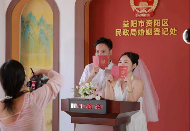 截至下午4点,资阳区民政局婚姻登记处共办理结婚登记36对,其中跨区县登记7对。前来登记领证的新人笑着说:“早就听说婚姻登记处搬到了明清古巷,就想让这有百年历史的巷子当我们爱情的见证人,在这领证,感觉像把爱情放进了时光的保险柜,比起在办公楼里登记更有仪式感。”