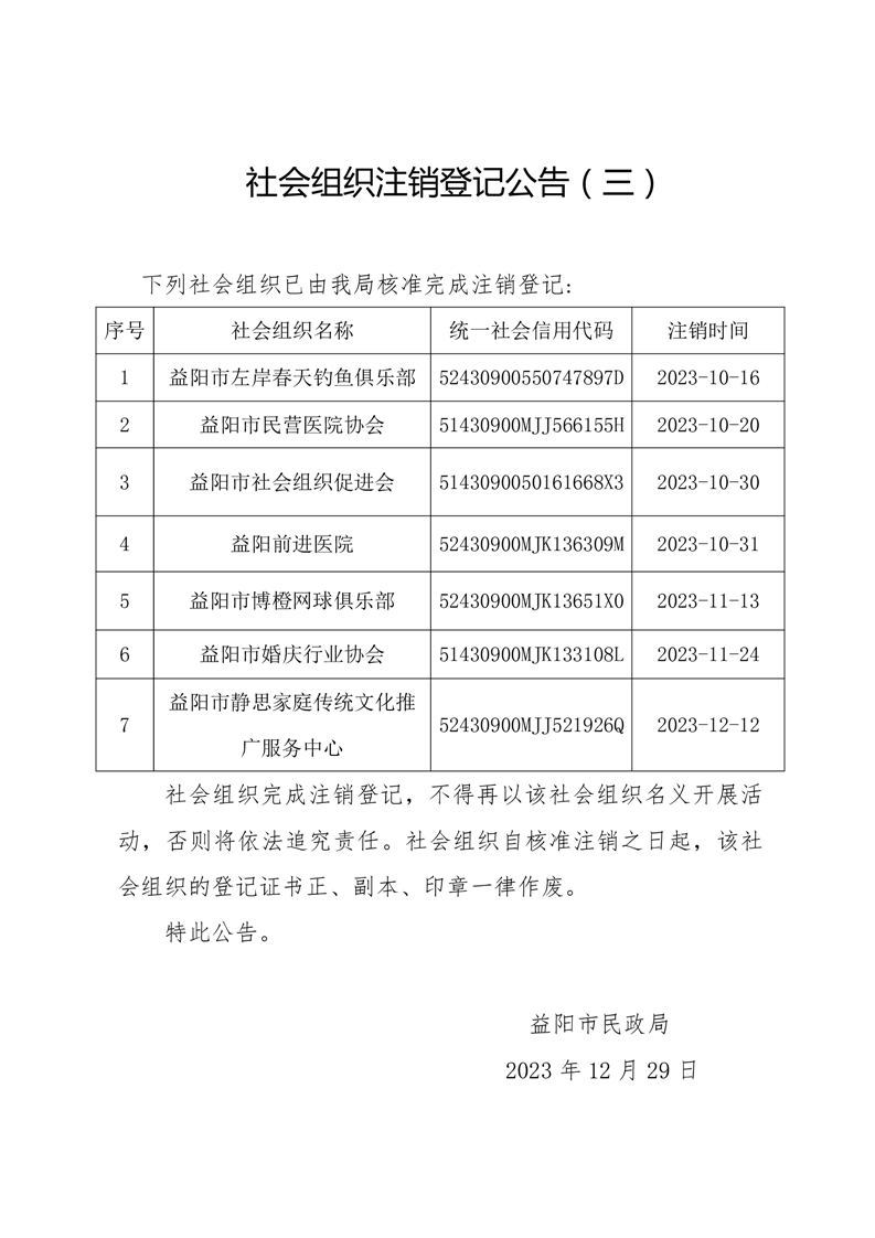 益阳市左岸春天钓鱼俱乐部等7家社会组织注销登记公告