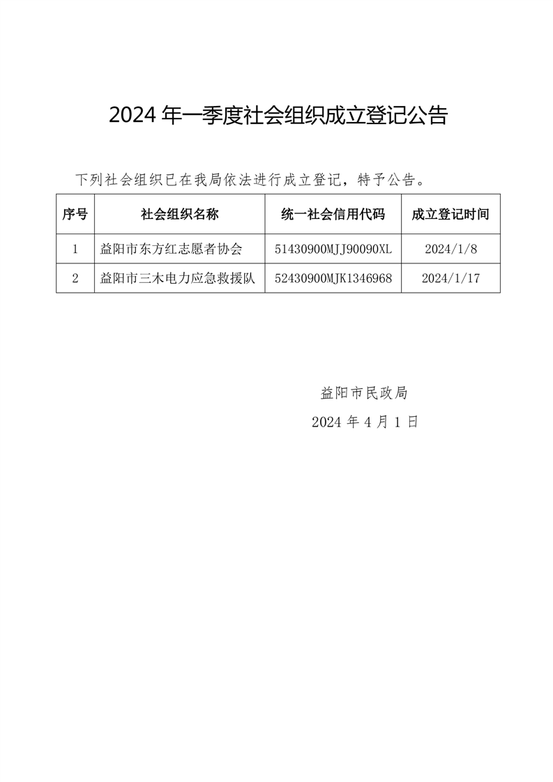 2024年一季度社会组织成立登记公告