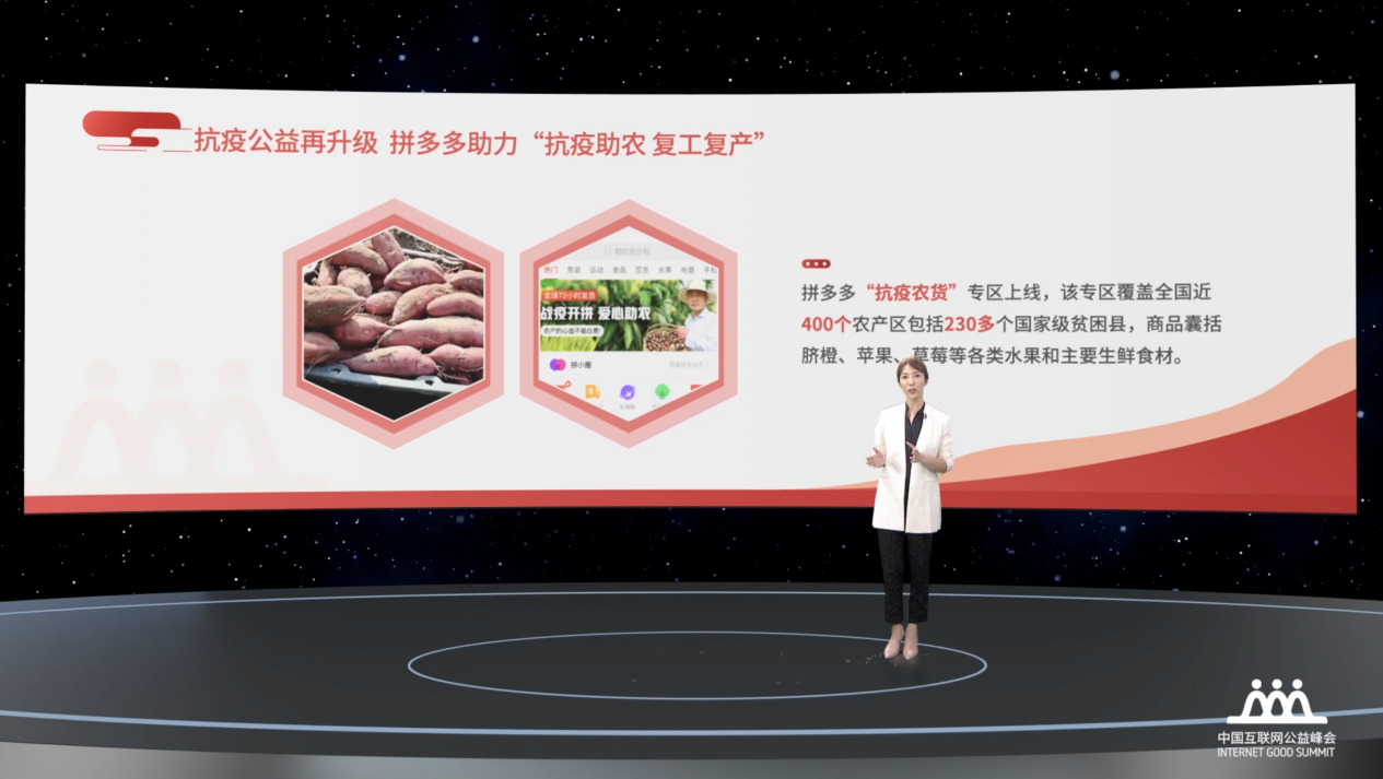 事实上,除了蚂蚁森林,阿里巴巴公益也在致力于更多公益探索。阿里巴巴公益基金会平台公益项目总监双玺在论坛上表示,阿里巴巴平台上产生的每一笔交易,都可能产生公益的属性。通过公益宝贝,阿里巴巴得以将公益行为融入到每一位商家和消费者日常生活场景中,将每一分钱的捐赠效用最大化,进行了持续的公益社会化培养。“通过区块链技术,我们为公益组织和项目提供公开透明的系统化解决方案,推动互联网公益的全透明、全跟踪、全覆盖。”“我们期望用区块链技术打造公益新样板”双玺呼吁,希望有一天整个互联网公益事业都能够围绕着信任力、感知力和参与力,在后疫情时代,成为公益新常态之下,真正推动社会发展的新增长点,“让互联网公益平台上的每一分善款,都能够有效地被看见。”作为互联网新型电商的代表,拼多多在疫情时代也在探索全新的公益模式。拼多多副总裁侯凯笛聚焦抗疫助农复工复产,讲述了拼多多从捐款捐物、平台专项补贴、解决农产品滞销问题到通过技术创新为农民打开新市场的战疫“四步走”。侯凯笛特别呼吁,外界关注以农产品直销为代表的小微企业的生存压力,在需求端明显收窄的时期与他们共克艰难。她坚信,公益与时间沉淀都有着独特的力量,只要踏实做好当下的一点一滴,必然会通过复利效应通往更加美好的新世界。