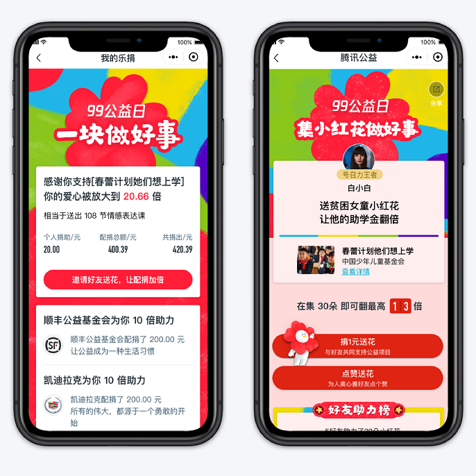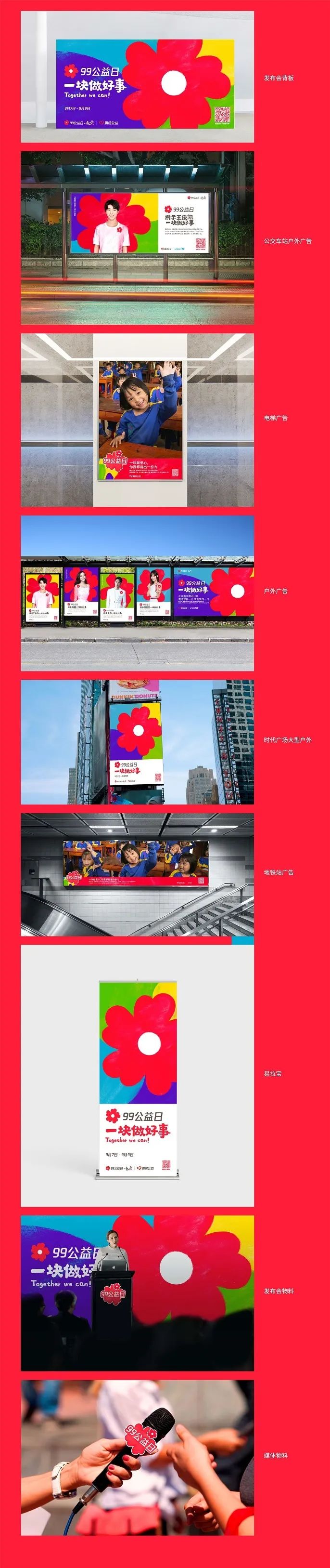 2020年的99公益日品牌形象升级了!在疫情时代的大背景,希望通过设计为广大用户带来一场“不一样"的99公益日。今年的设计方案围绕99的活动调性,保持99公益日已有的理念, 结合“一块做好事”活动Slogan,打造具有行业识别的公益活动。为了方便小伙们更好的使用,下面将介绍99公益日设计背后的故事。“小红花"是18年推出的公益符号,通过两年的推广已经成为99公益日的品牌icon。今年将延续突出“小红花”符号,并将其与新的设计语境相结合。“通过由捐助者,受助者共同用蜡笔绘制出一朵朵疗愈人心的小红花,使用质朴童真的手绘风格,向大家讲述公益故事背后一个个温暖人心的故事。”“小红花”形象在保留标志性的元素(爱心花瓣)特征下,通过蜡笔手绘的质感提炼并体现出99公益日温暖人心的品牌调性。主视觉将手绘质感的小红花作为主视觉的重点元素突出表现,并根据不同领域的公益项目(疾病救助、自然保护、教育助学、扶贫救灾)总结归纳的四种辅助色。辅助色的增加丰富了品牌的专属性与亲和力。四色的色块在动势上向小红花汇聚,搭配手写体充分体现出 “一块做好事”的99公益日的品牌精神。为了配合品牌故事和设计风格,突出“一块做好事”的活动口号,新增方正手书体用于主视觉及线上、线下的延展应用中。新增角标设计元素,保证了99公益日小红花icon的品牌露出,并满足各类线上、线下各类场景应用。通过往年99公益日的线下应用场景的分析,总结提供了以下经典场景的设计规范。今年的99公益日将线上、线下视觉规范总结成为品牌传播声量示意图。各位小伙伴可以在下图中找对应场景的设计稿。从而有目标的选择规范中的各类模板,通过规范模板的使用,让99公益日的品牌形象更加整体统一。为了将99公益日打造成具有行业识别的公益活动,需要各位小伙伴一起联手,将设计规范贯彻落地到每一个设计中。