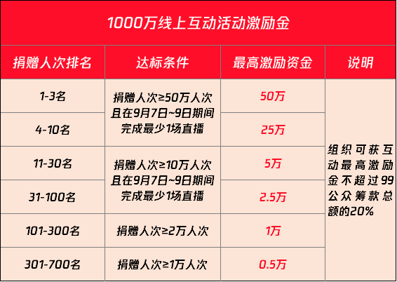 99公益日希望能够打造更优质的行业生态,对公益生态建设起到表率作用的公募组织,提供1000万元非限定激励。99公益日鼓励公益慈善组织分享自身经验,帮助潜力公益伙伴成长,建设共享互助的行业氛围。今年将提供1500万元非限定性激励金、荣誉纪念品,支持积极分享经验、帮助伙伴成长的公益慈善组织。99公益日鼓励公益慈善组织通过线上直播、微信公众号、粉丝团、视频号等开展公益活动,打造更丰富的线上公益场景。今年将提供1000万元非限定性激励金、总计7亿曝光人次的线上广告金激励、超100万件小红花物料,支持开展线上互动活动的公益慈善组织。具体如下:● 激励规则:根据公益慈善组织7-9日三天线上互动活动的捐赠人次数据确定奖励资金。通过直播公益、爱豆公益、联动微信公众号发文的公益慈善组织,有机会获得总计7亿曝光人次的线上广告金激励。参与以上任何一种线上活动的公益慈善组织,有机会获得总计100万件小红花物料。2020年99公益日,为鼓励提供惊喜时刻(非定向)配捐的公募组织,提供总计约3亿曝光人次的广告投放激励。同时,将继续支持爱心企业与公益积极联动,提供总计约1亿曝光人次的广告投放机会,让爱心企业的公益品牌、公益理念连接更多用户。免费提供总计5亿曝光人次的线下广告激励,支持99项目进行线下展示;另外,公益慈善组织可通过资源置换、企业捐赠或自己购买等渠道获取免费/收费线下广告资源,若广告市场价值超过20万,可获得线上广告投放激励;若广告市场价值超过50万,可申请在99三天投放。★ 报名开始时间:7月6日,详情请关注”腾讯公益伙伴“公众号后续推送通知。为鼓励公募组织持续探索互联网公益,腾讯基金会还将额外给予非限定性配捐特别激励,即往年99公益日与日常劝募活动积极动员并取得良好效果的公募组织,非限定性配捐有机会翻倍。