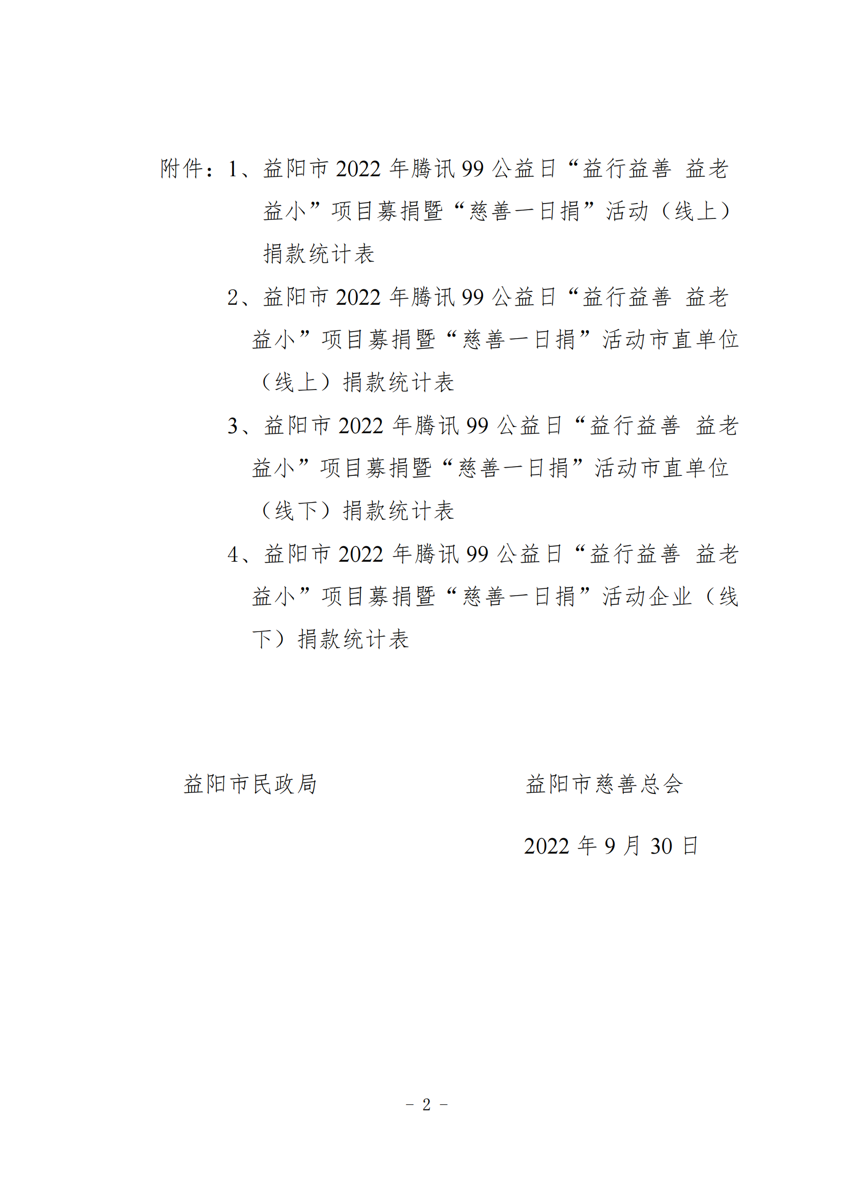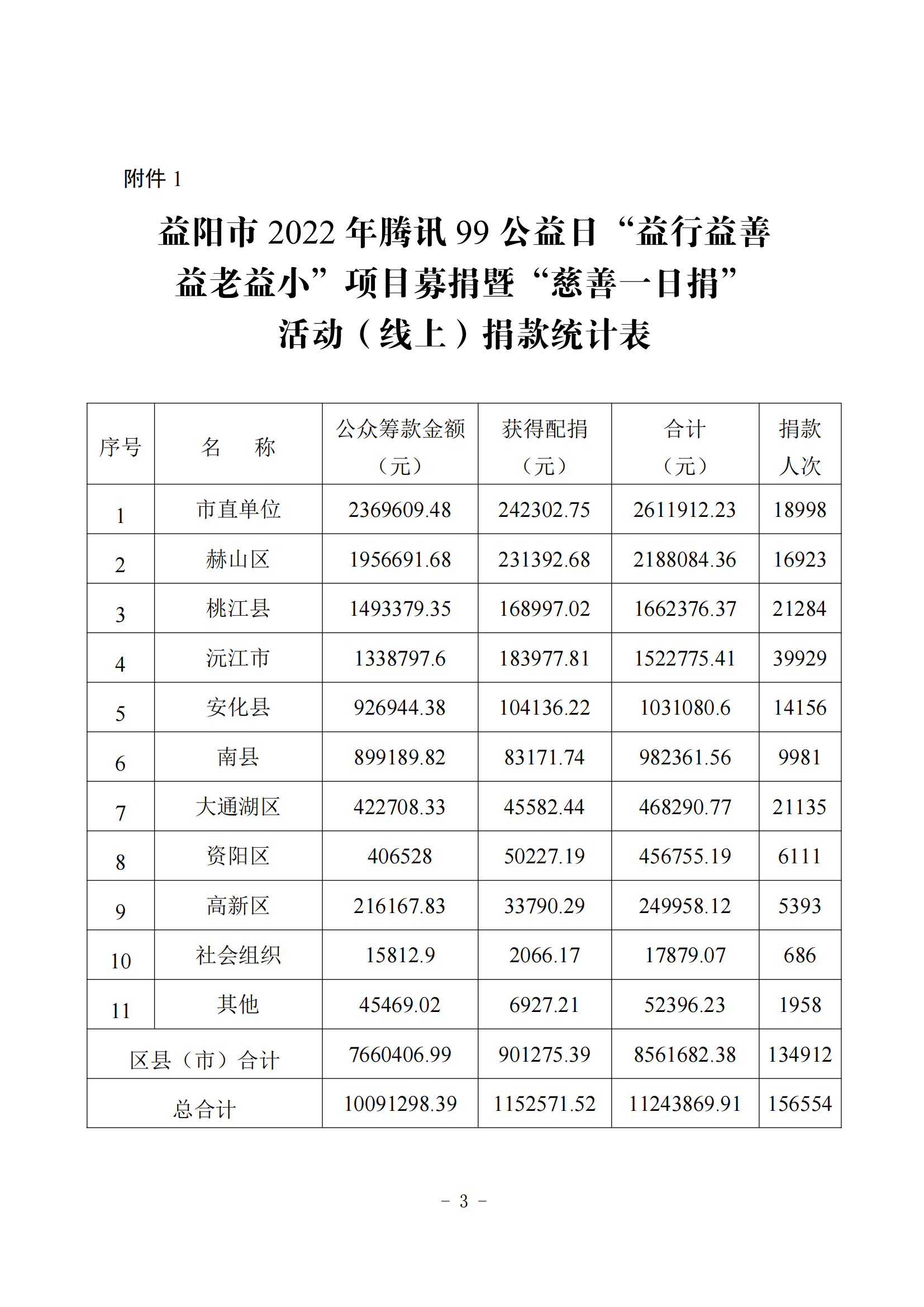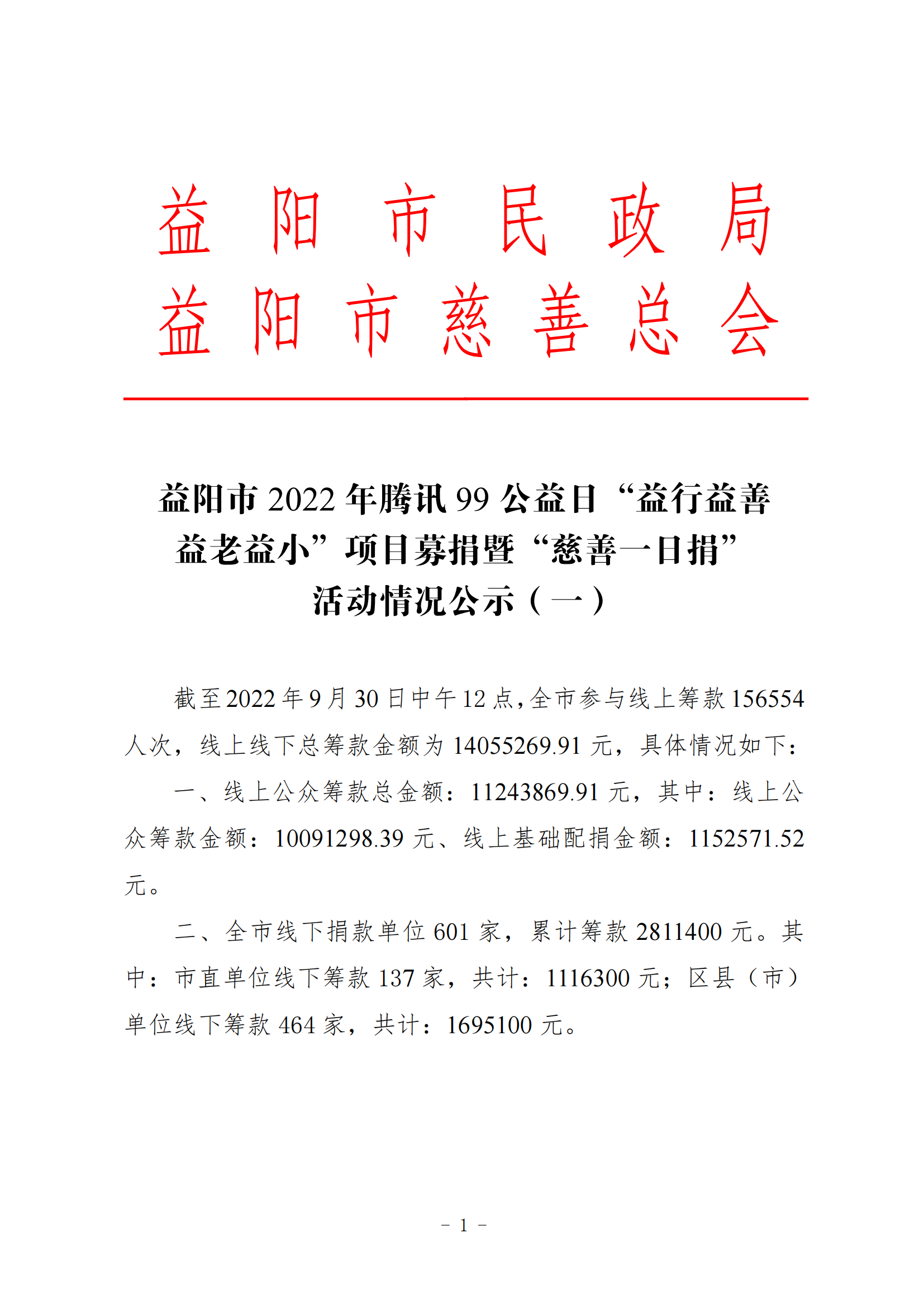 益阳市2022年腾讯99公益日“益行益善 益老益小”项目募捐暨“慈善一日捐”活动情况公示(一)