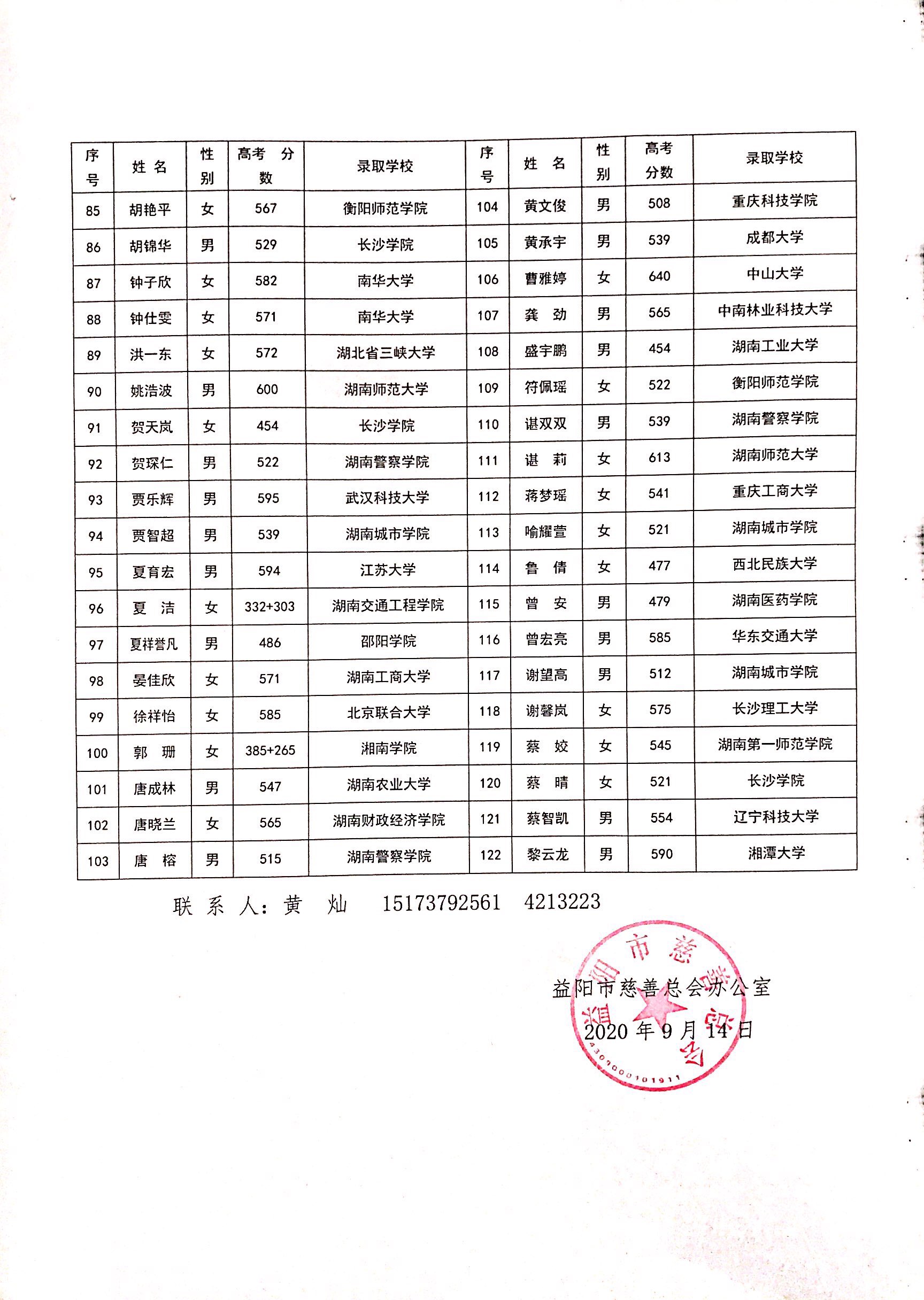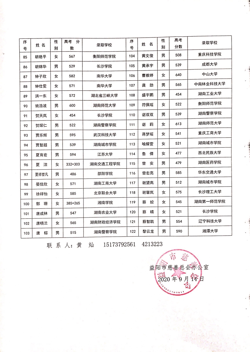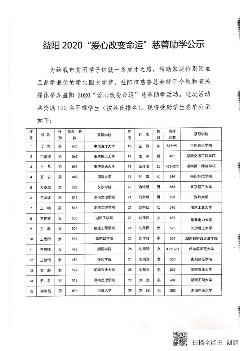 益阳2020“爱心改变命运”慈善助学公示