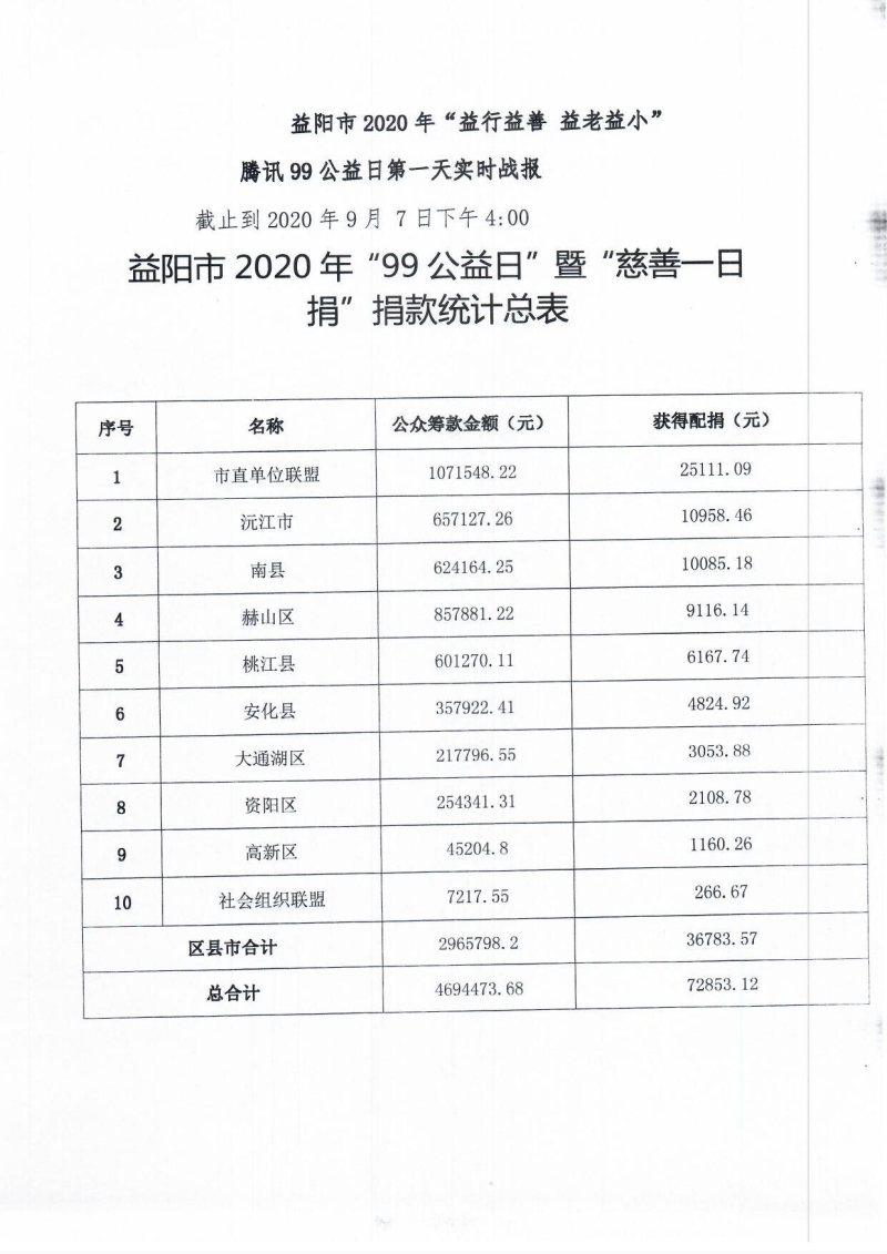 截止2020年9月7日下午4点,全市公众筹款金额469.4473万元,基础配捐金额:7.2853万元,获得非限定性配捐金额35.7万元。全市总筹款金额为476.73625万元。