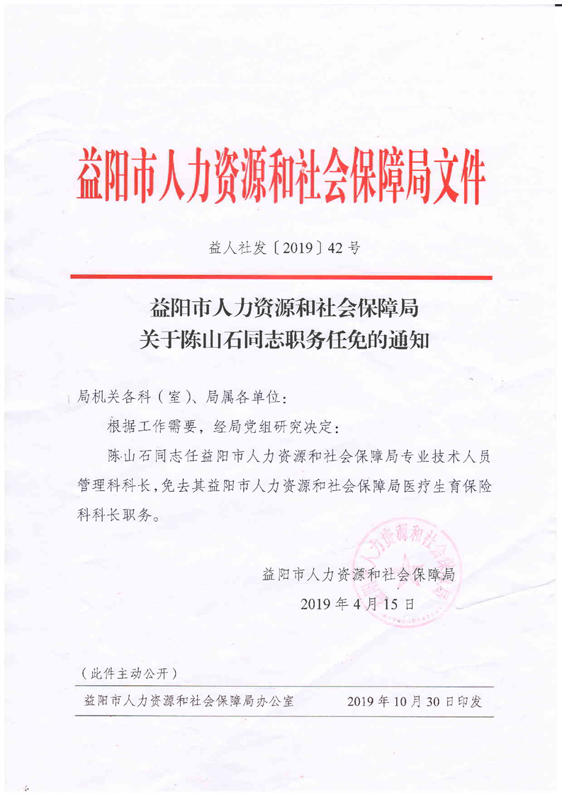 益人社发〔2019〕42号 关于陈山石同志职务任免的通知