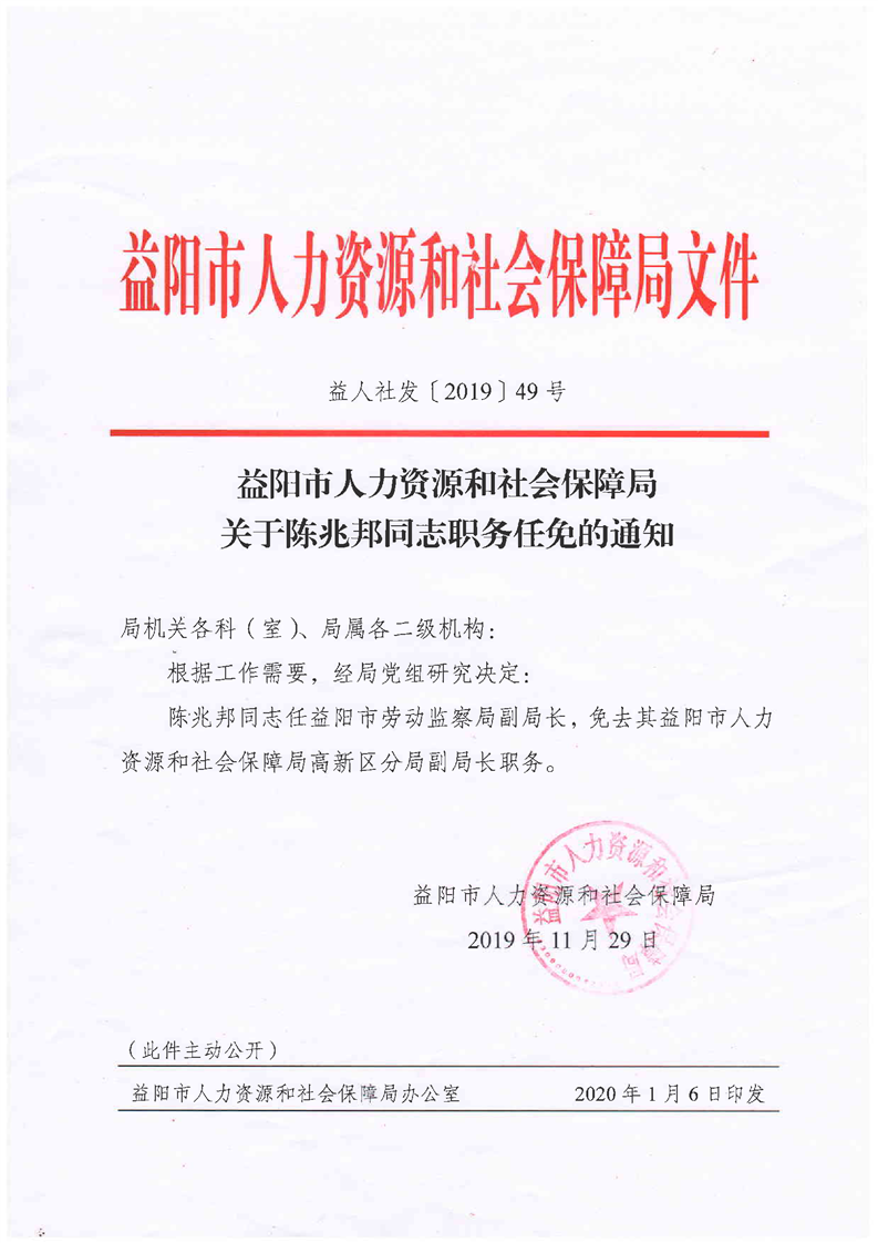 益人社发〔2019〕49号 关于陈兆邦同志职务任免的通知