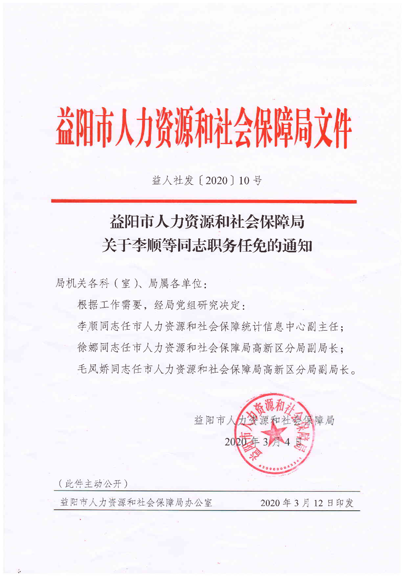 益人社发〔2020〕10号 关于李顺等同志职务任免的通知