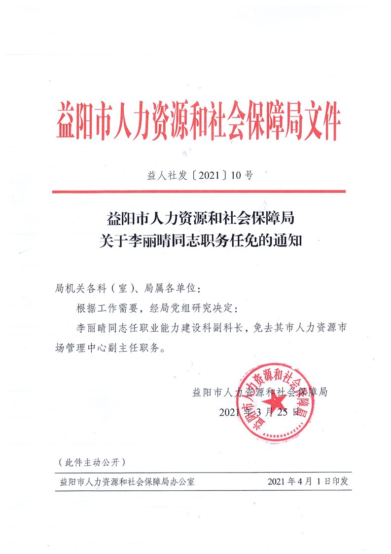 益人社发【2021】10号 关于李丽晴同志职务任免的通知