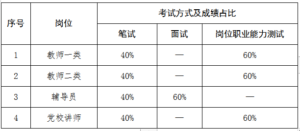 (1)考生参加招聘岗位全部考试。各岗位类型考试方式及成绩占比(见下表)