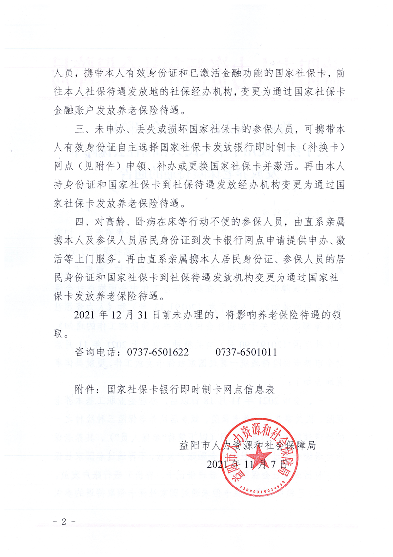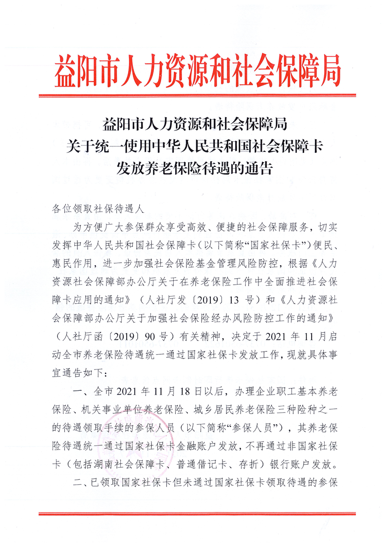 益阳市人力资源和社会保障局关于统一使用中华人民共和国社会保障卡发放养老保险待遇的通告