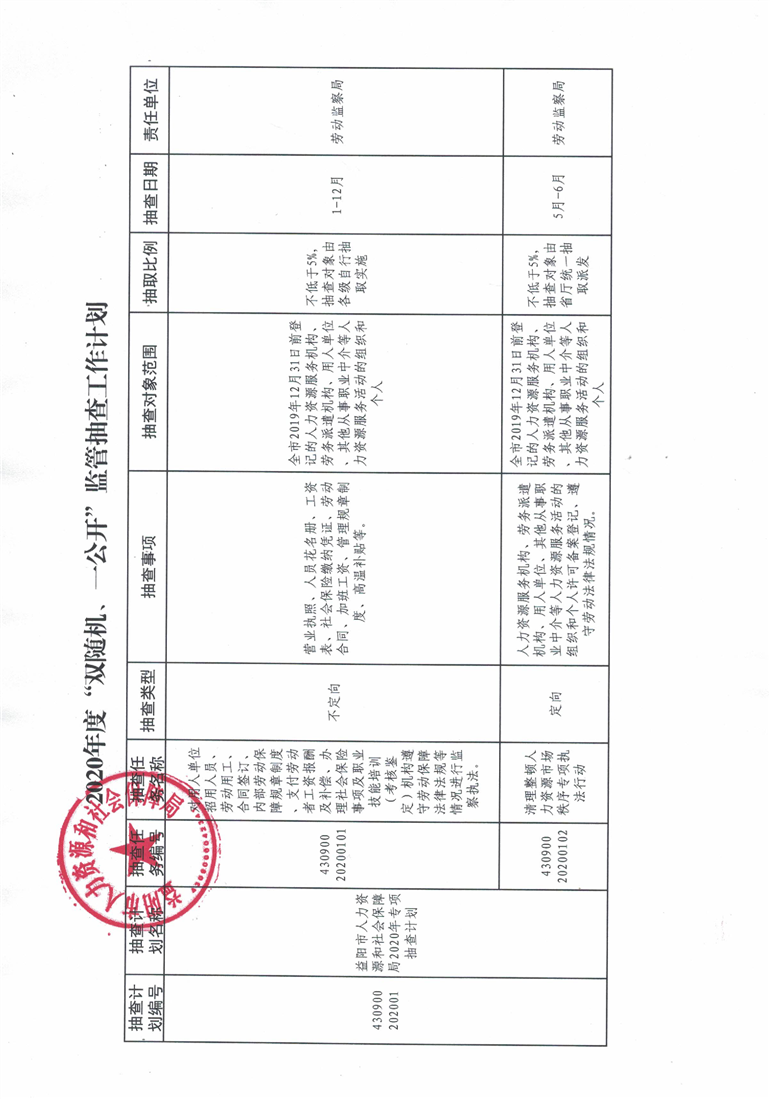 2020年度“双随机、一公开”监管抽查工作计划