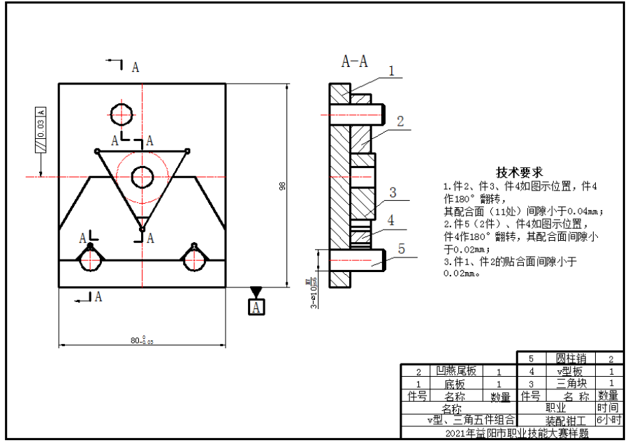 本次竞赛以《装配钳工国家职业技能标准》三级以上为依据。参赛选手根据赛件图样要求,在规定时间内,以现场操作的方式完成赛件产品的加工。