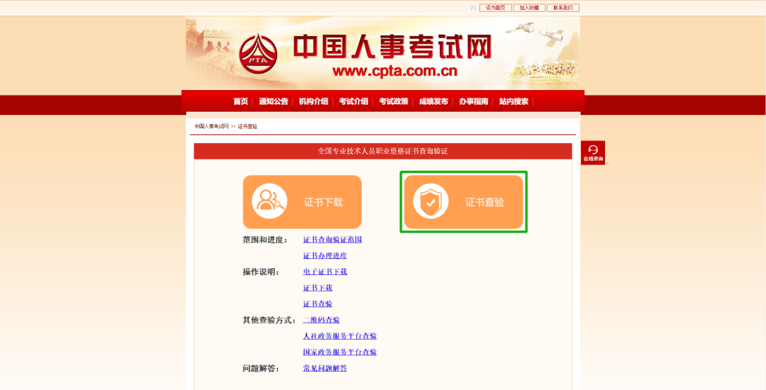 访问中国人事考试网(www.cpta.com.cn)首页,点击左侧菜单中的[证书查验]。