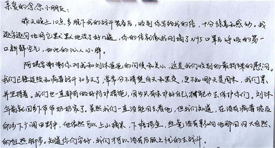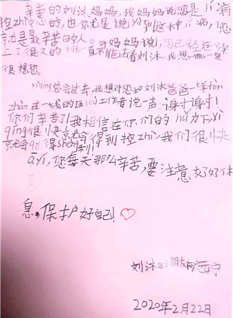 2月22日,是益阳市疾控中心全员连续日夜奋战在疫情一线的第30天,这一天,检测检验科许芳收到了一封特别的信,这是来自于她上小学一年级的儿子的同学——念念小朋友的一封信,念念小朋友情真意切,真心感谢像同学的爸爸妈妈一样奋战在一线的医务人员,并叮嘱阿姨好好休息,保护好自己。