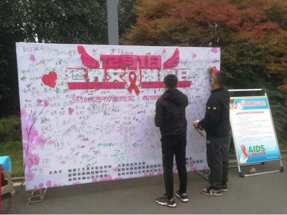 为了更好响应国家及省启动的“世界艾滋病日”活动,进一步提高艾滋病性病防治宣传教育工作的针对性、可及性、可接受性,营造我市全民参与艾滋病性病防治工作的良好氛围,构建人类卫生健康共同体。我市继续开展以倡导主动检测为主题的“艾滋病检测月”和“性病防治主题宣传周”系列活动。12月1日上午,市疾控中心党员干部志愿者在秀峰公园西门进行了定点艾滋病性病防治知识宣传,活动期间发放艾滋病宣传海报100余份,艾滋病知识宣传折页、小册子,印有艾滋病宣传知识的手提袋、抽纸等宣传品共2000余份。为了更好的让青少年了解艾滋病性病防治科普知识,下午,市疾控中心工作人员在湖南工艺美术学院进行了校园防艾宣传活动,活动场地设置了携手防疫抗艾、共担健康责任签名墙,对过往师生发放宣传资料,共发放宣传册、宣传抽纸等宣传品1000余份。同时对200余名师生开展了防艾健康知识讲座,培训期间,全体师生进行了抗击艾滋病宣誓。本次活动让师生对艾滋病性病流行趋势有了更清晰的认识、共同抗击艾滋病,增强个人健康意识。