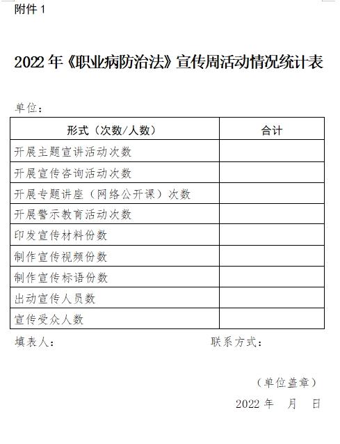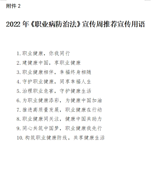 2022年4月25日至5月1日是第20个《职业病防治法》宣传周。为认真贯彻党中央、国务院关于职业病防治工作的决策部署,深入宣传贯彻《职业病防治法》,进一步推动用人单位落实职业病防治主体责任,切实保障广大劳动者职业健康权益,现就2022年《职业病防治法》宣传周活动有关事项通知如下: