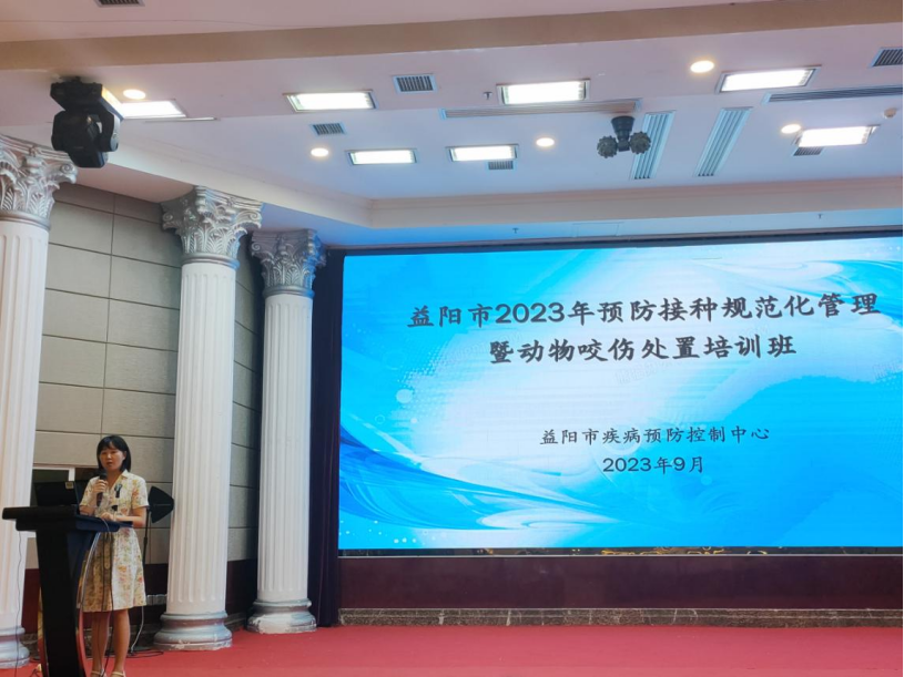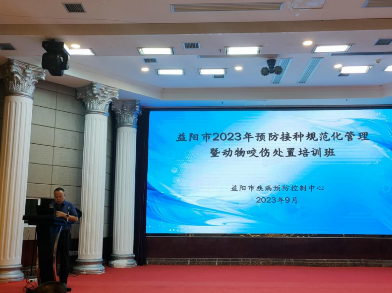 2023年9月19日-20日,益阳市疾控中心举办益阳市2023年预防接种规范化管理暨动物咬伤处置培训班。市疾控中心党总支书记、主任杨建明和市卫健委疾控科科长罗雅婕出席培训班并讲话,市疾控中心工会主席王正良主持会议。