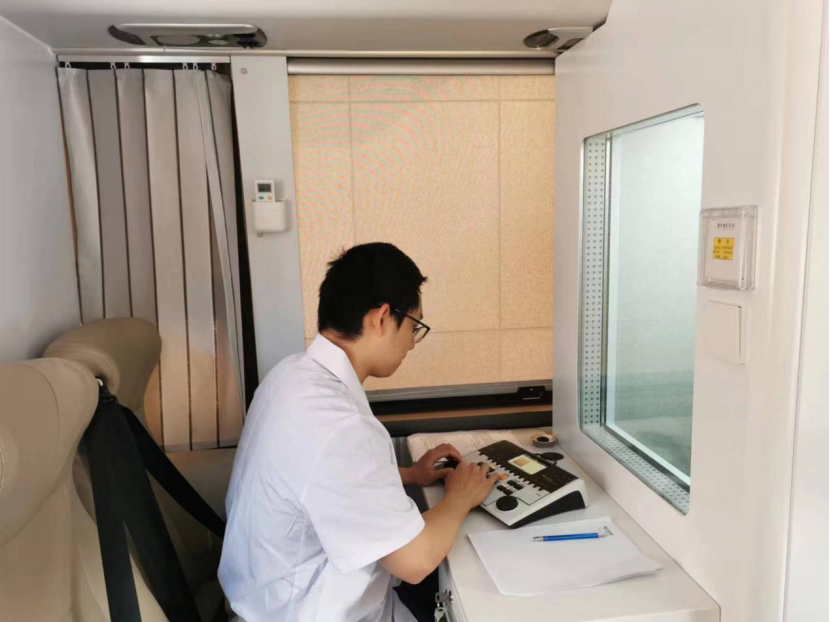 图一:益阳市疾控中心医生在体检车上为劳动者做纯音听阈检查