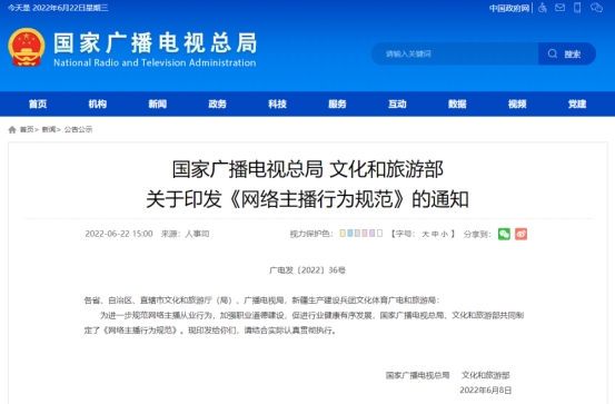 为进一步规范网络主播从业行为,加强职业道德建设,促进行业健康有序发展,国家广播电视总局、文化和旅游部共同制定了《网络主播行为规范》。现印发给你们,请结合实际认真贯彻执行。