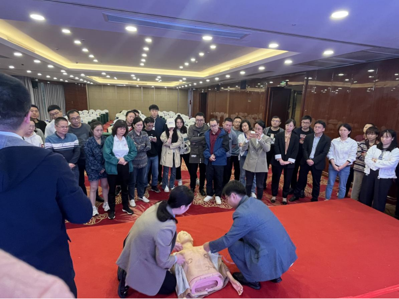 培训班还邀请了市中心医院曹曙团队对参会人员进行了第一目击者培训。曹曙讲解了心肺复苏、气道异物急救与处理技术,曹曙团队对参会人员进行了心肺复苏、体外自动除颤仪(AED)等实践操作技能培训。