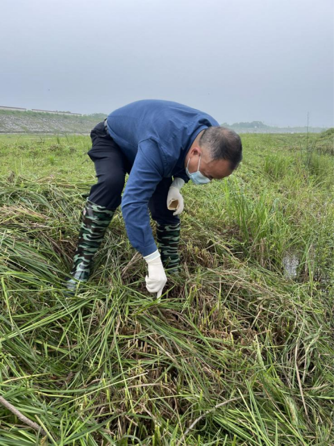 图2 杨建明在资阳区刘家湖垸外现场查螺