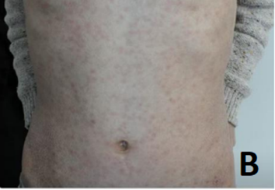 Ⅱ期梅毒:主要表现为梅毒疹,包括斑疹、斑丘疹、丘疹、鳞屑疹、毛囊疹或脓疱疹等。这些皮疹可分布于躯干、四肢屈侧等部位,常对称分布,不痛不痒。此外,还可能出现扁平湿疣、梅毒性秃发等症状。