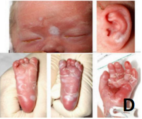 图A、B、C依次是Ⅰ期、Ⅱ期和Ⅲ期梅毒,加上没有任何临床症状与体征的隐性梅毒,共四种为后天梅毒;图D为先天梅毒。